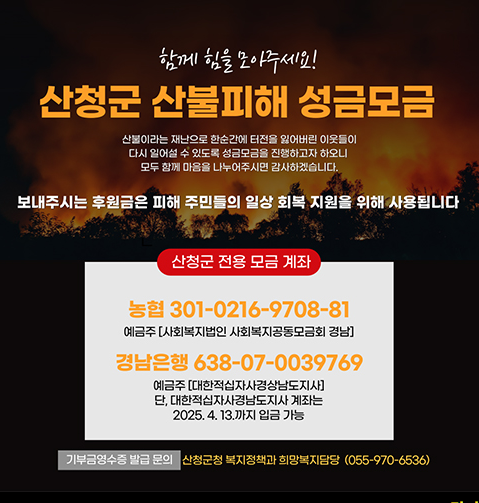 SNS에 #경북산불 #산청산불 #힘내라경북 #힘내라산청 같은 해시태그로 응원 글을 올려보세요.