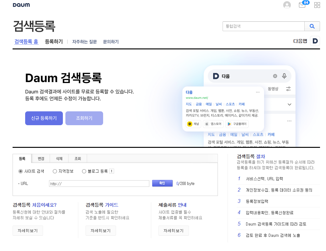 그래서 다음 검색 등록 페이지에 가서 블로그 등록을 신청을 했다.