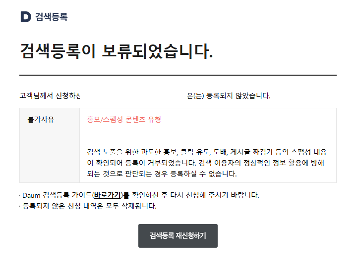 그런데 웬일... 다음 등록 보류 메일이 왔다. 그런데 불가사유가 더 당혹스러웠다. 내 글이 홍보/스팸성 콘텐츠 유형이라니 거기다가 게시글 짜집기 등의 스팸성 내용이 확인되어 등록이 거부되었다는 거였다.