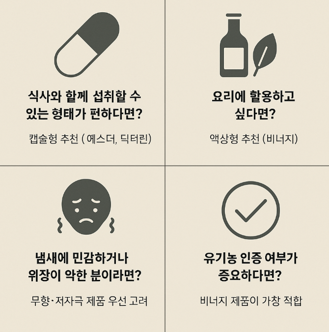 ▶ 요리에 활용하고 싶다면? → 액상형 추천 (비너지)