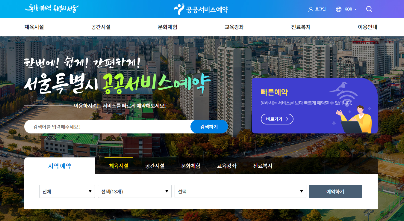 서울특별시 공공서비스예약 시스템은 서울시와 산하기관, 25개 자치구에서 제공하는 다양한 공공서비스를 온라인에서 쉽게 예약하고 결제할 수 있는 통합 플랫폼입니다. 이를 통해 서울 시민들은 체육시설, 대관시설, 교육 프로그램, 문화 행사, 시립병원 진료 등 약 7,000여 개의 서비스를 한곳에서 간편하게 예약할 수 있습니다. 이 서비스는 서울 시민들이 일상 속에서 공공시설을 보다 편리하게 접근할 수 있도록 돕기 위해 마련되었습니다.