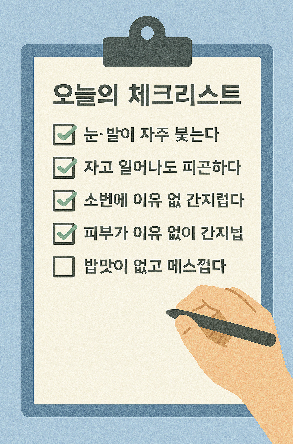 ☞ 2가지 이상 해당된다면, 병원에서 소변검사와 혈액검사부터 받아보세요.