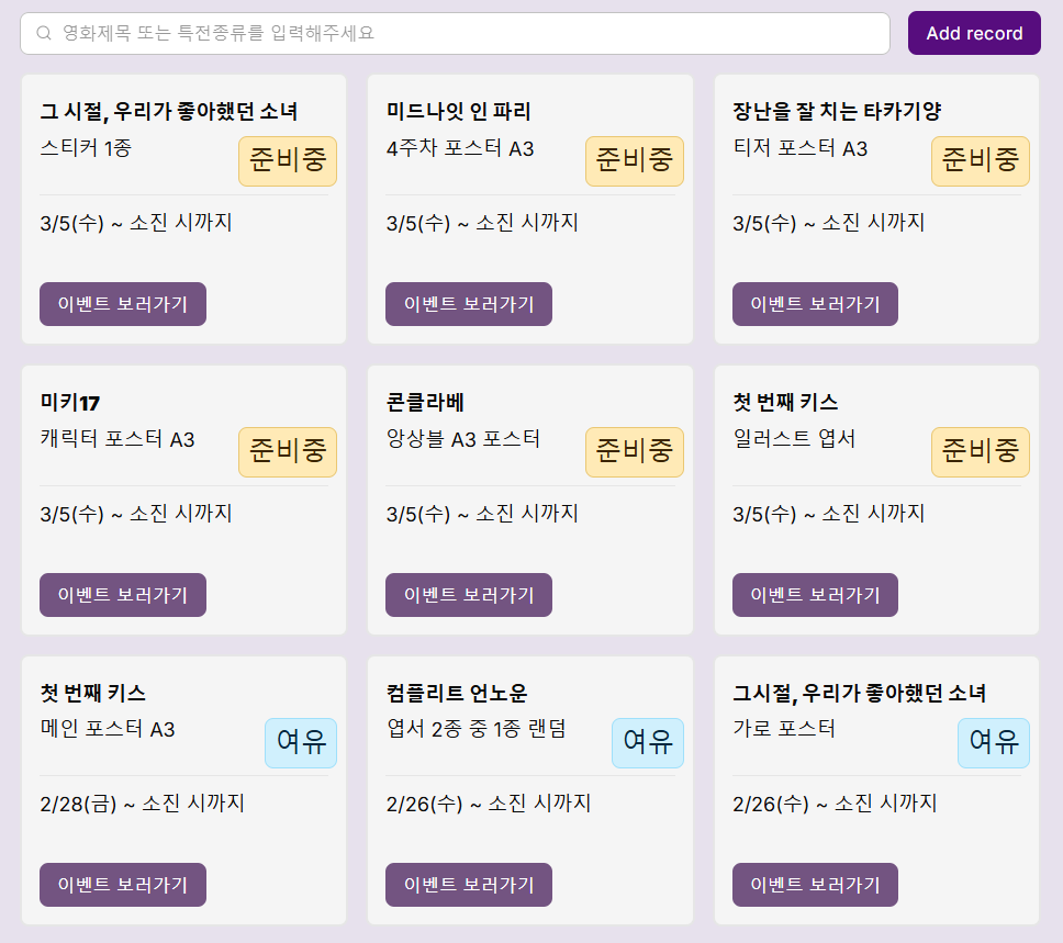 - 영화 시사회, 드라마 팬미팅, 애니메이션 페스티벌 등 참여 이벤트 정보를 얻을 수 있습니다.