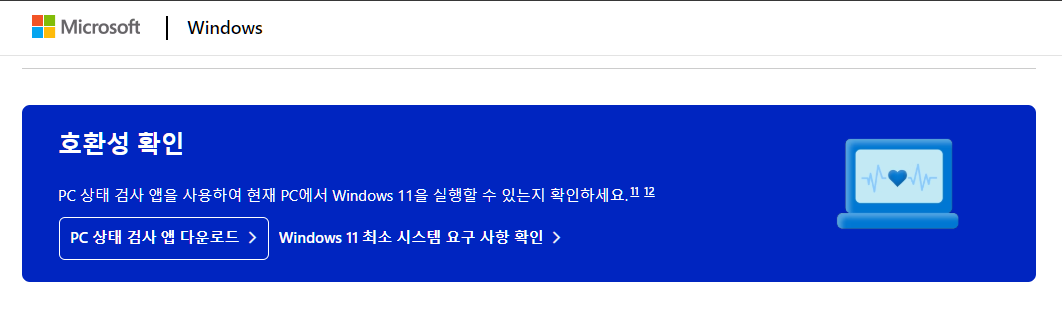 마이크로소프트에서 제공하는 PC 상태 검사 도구를 설치해보세요. 클릭 한 번으로 내 컴퓨터가 윈도우11을 설치할 수 있는지 바로 확인해줍니다.