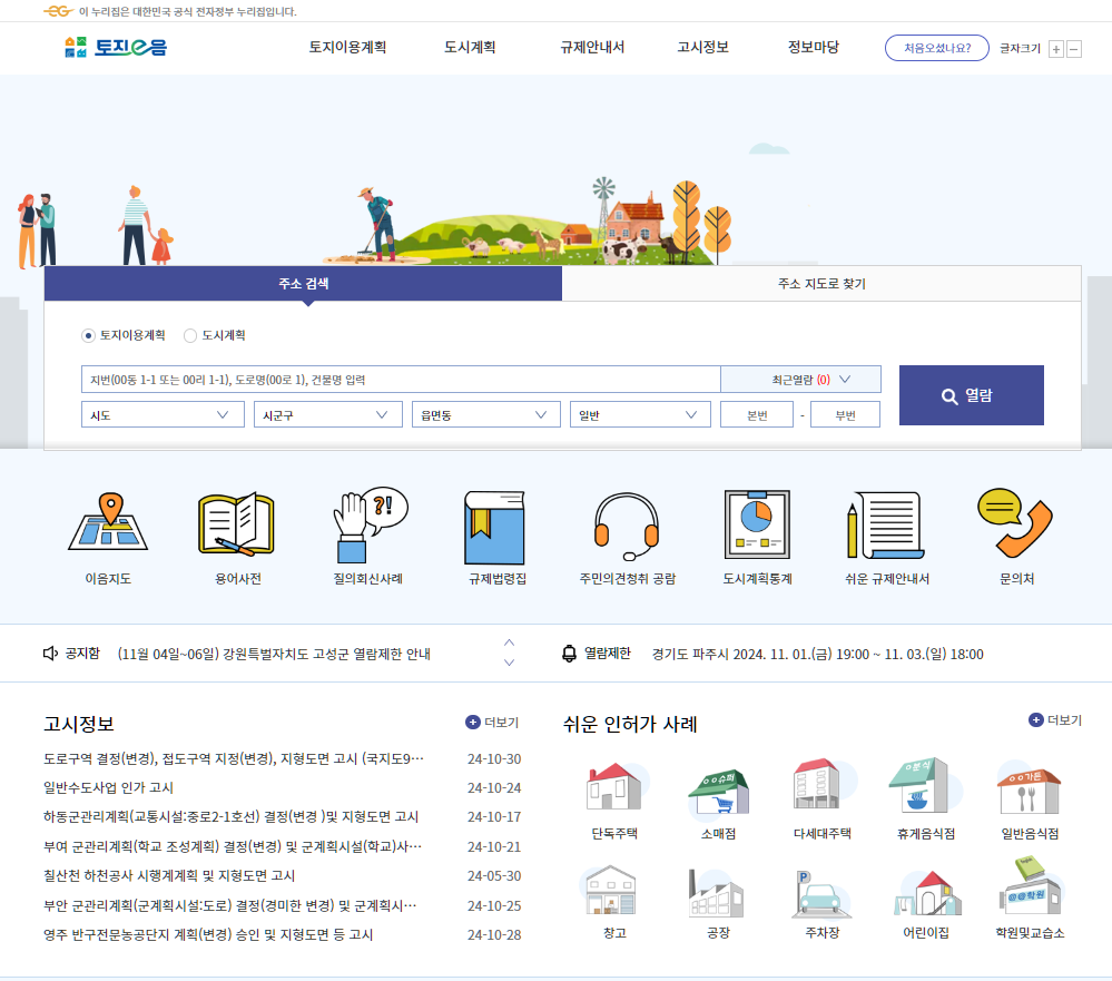 토지이음 웹사이트에 접속합니다. 메인 페이지에서 사용자가 원하는 기능을 선택할 수 있습니다. - 토지 검색: