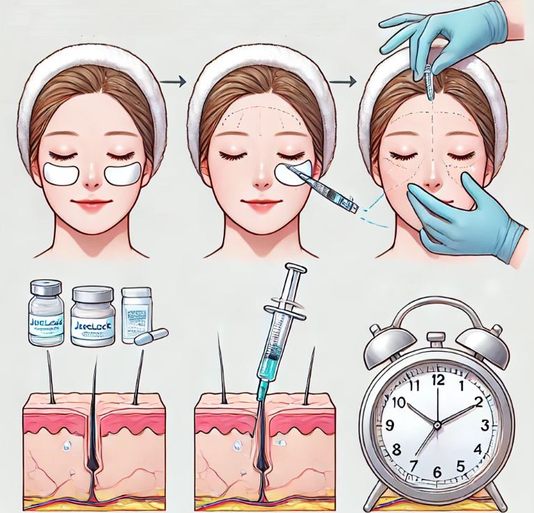 - 주입: 쥬베룩을 식염수와 섞어 액체로 만든 후, 주사 바늘을 통해 피부에 주입합니다.