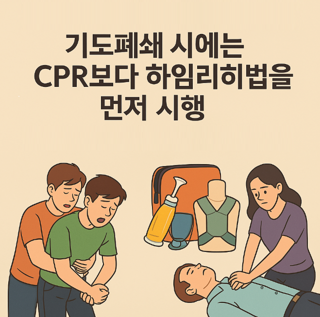 기도폐쇄 상황에서 CPR부터 시행하는 경우가 종종 있습니다. 하지만 이는 치명적인 실수일 수 있습니다. CPR은 심정지 환자에게, 하임리히법은 질식으로 기도가 막힌 환자에게 시행해야 하는 전혀 다른 응급처치입니다.