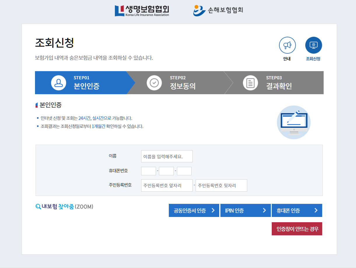 생명보험협회 또는 손해보험협회 고객센터에 문의하여 기술적 문제나 로그인 오류에 대한 도움을 받을 수 있습니다. 고객센터 전화번호는 ☏ 1332입니다. - 숨은 보험금이 없다고 나올 때 :