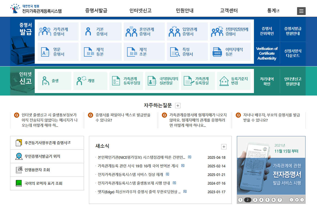 전자가족관계등록 시스템: 가족관계증명서, 기본증명서 모두 온라인 발급 가능