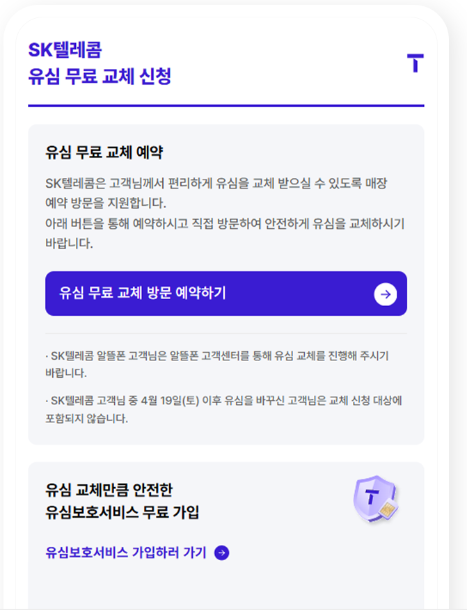유심 교체는 기존 유심을 폐기하고 새 유심으로 바꾸는 방법입니다. 보안적으로 가장 강력하며, SKT는 이를 전국 대리점 및 온라인을 통해 무상 지원하고 있습니다.
