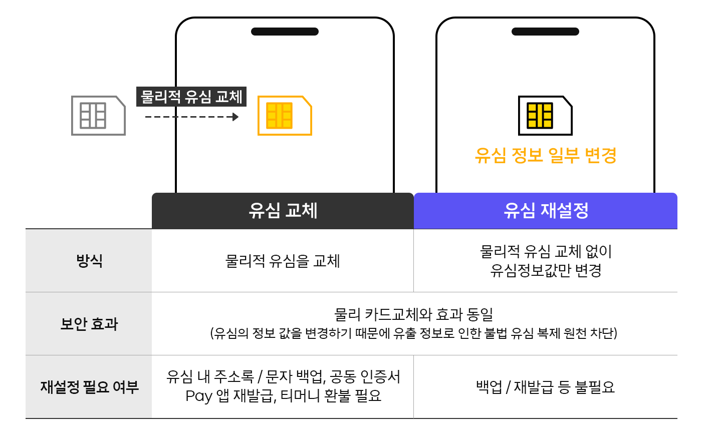 A. 유심 재설정은 유심 교체와 달리, 유심을 그대로 두고 유심 정보 중 일부 내용을 변경하는 방식입니다. 처리 방식에는 차이가 있지만, 결과적으로는 동등한 효과를 기대할 수 있습니다.